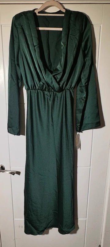 The DLSB Dark Green Satin Wrap Maxi Dress is available in sizes S.