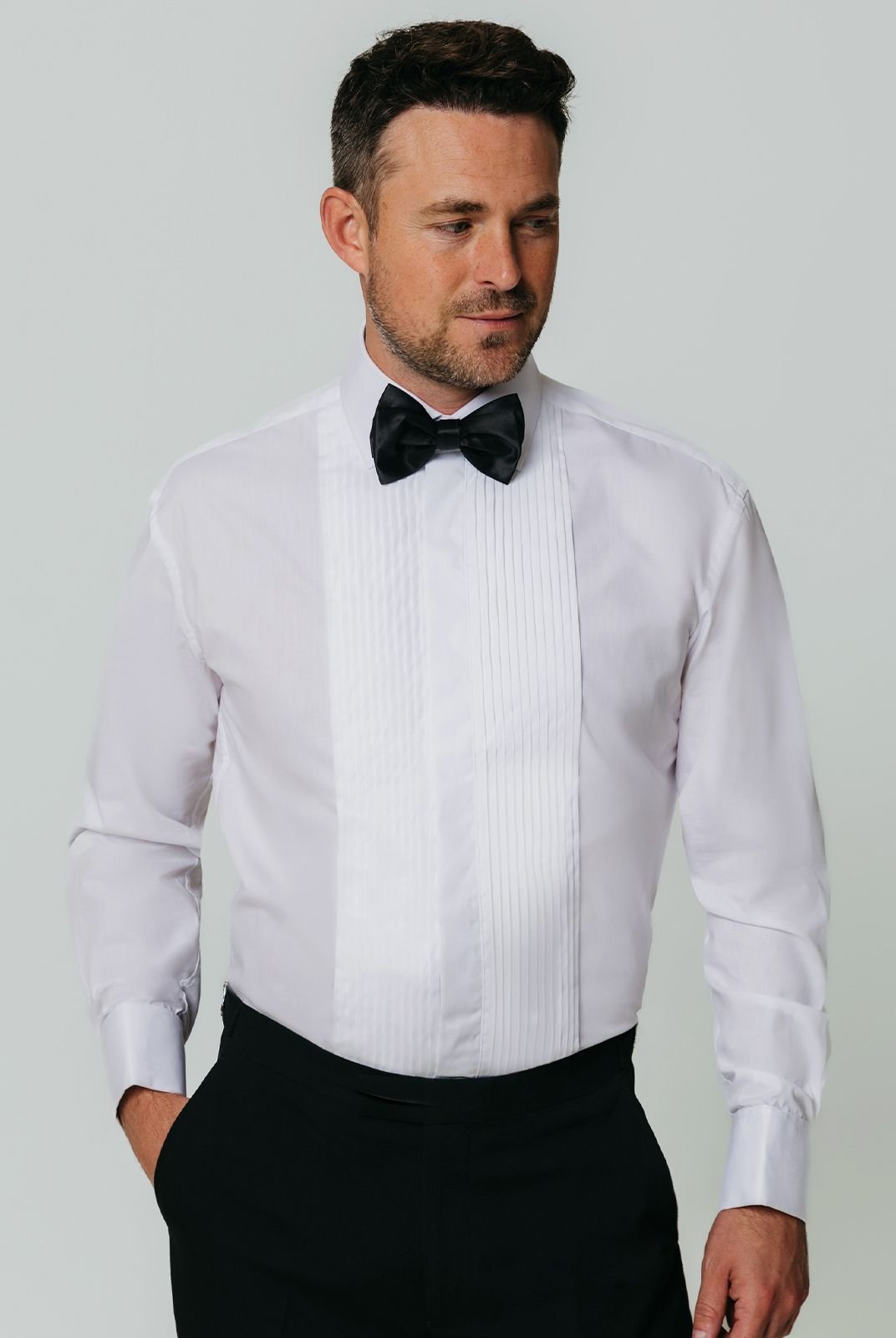 The Dobell Men's White Pleated Front Slim Fit Dress Shirt is ideal for formal, black-tie, evening.