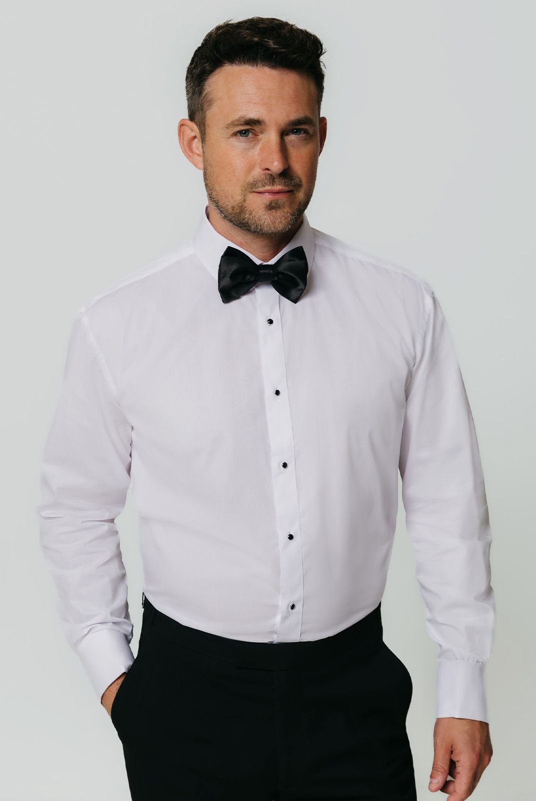 Classic white dress shirt with elegant stud buttons for a refined touch. Ideal for Black Tie events or special celebrations. Made from a high-quality cotton blend for a sharp silhouette and comfort.