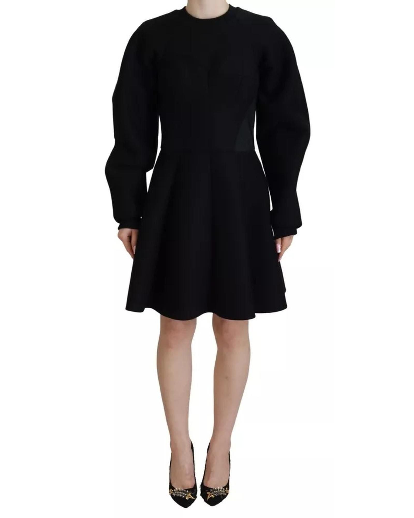 Sophisticated black cotton A-line mini dress by Dolce & Gabbana. Features a round neckline and full-length sleeves. The fitted bodice flares into a knee-length skirt. Perfect for evening events or formal occasions.