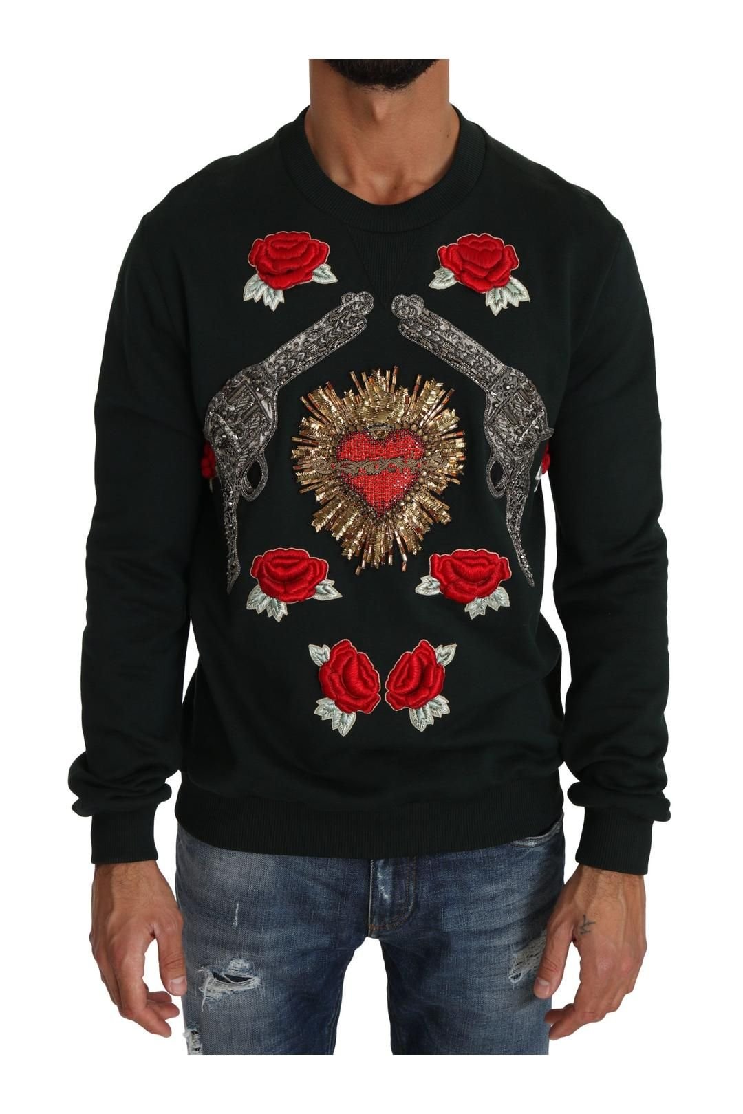 The Dolce & Gabbana Green Crystal Heart Roses Gun Sweater is available in sizes M.