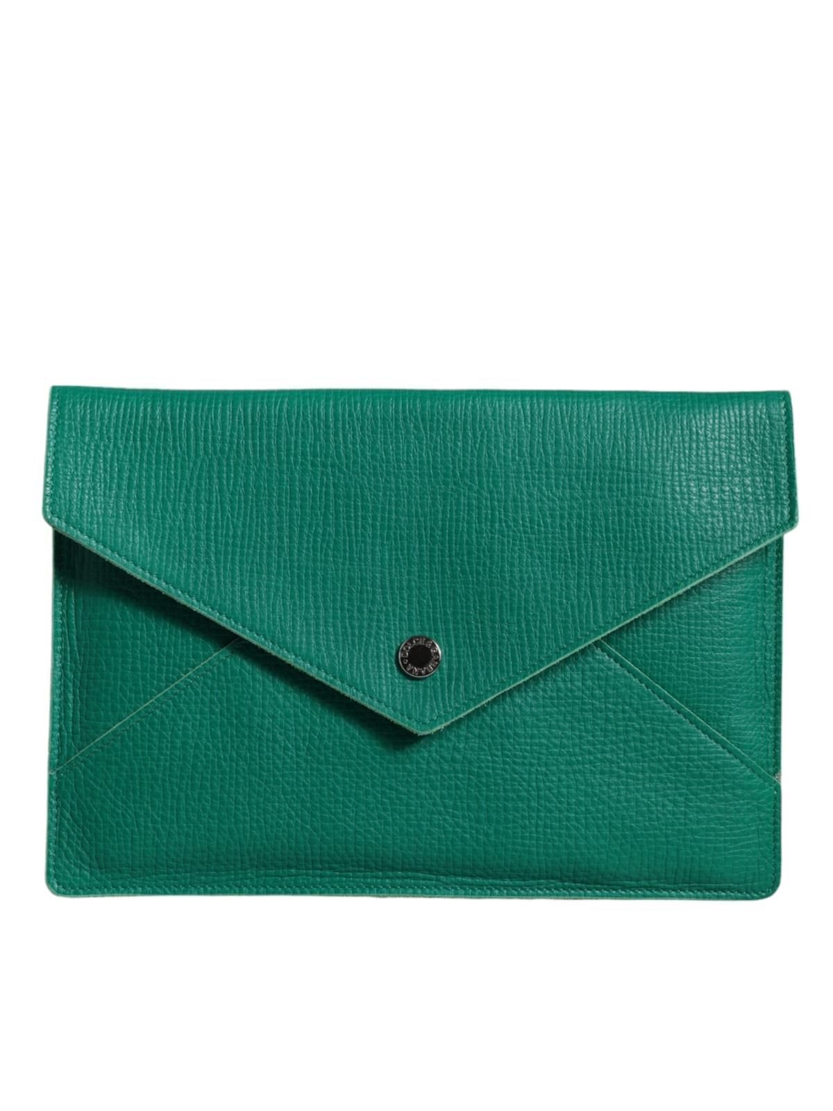 Luxurious Dolce & Gabbana clutch bag in green leather with a sleek envelope design. Features a snap button closure and a textured leather finish. Ideal for carrying essentials like a tablet, keys, and a small wallet.