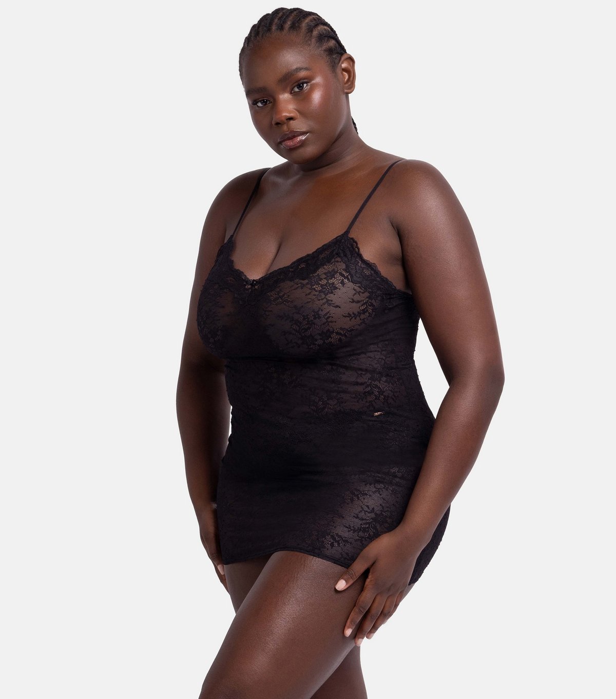 Stylish black lace cami dress by Dorina featuring a V-neckline and adjustable straps. Ideal for casual and intimate occasions.