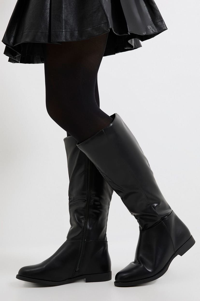 Sleek knee-high boots in black PU with a flat heel for all-day comfort. Features a full-length inner zip and subtle stitching for a refined look.