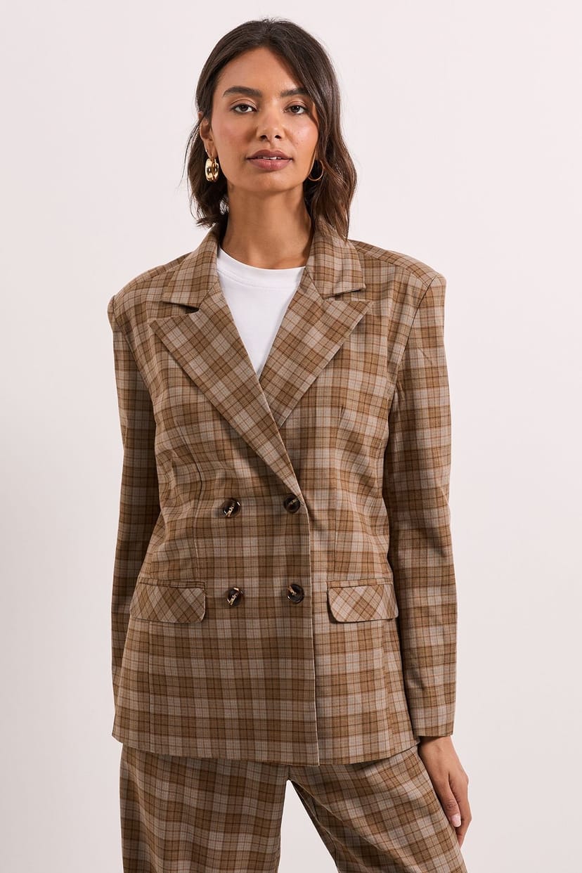 The Dorothy Perkins Brown Check Double Breasted Blazer is available in sizes 10, 12, 14, 16.