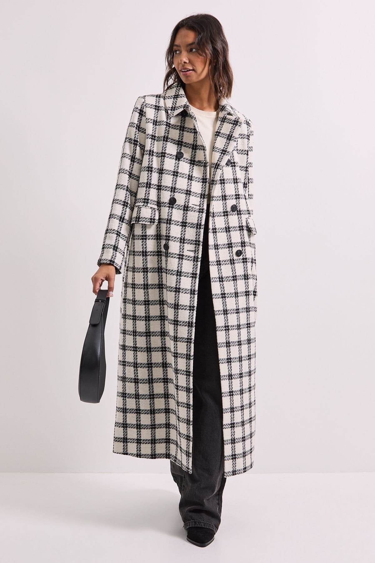 Striking check pattern longline coat with a classic collared neckline. Features an elegant double-breasted button fastening for a sophisticated silhouette. Includes practical side pockets for convenience. Designed in a versatile regular fit to layer comfortably over seasonal outfits.