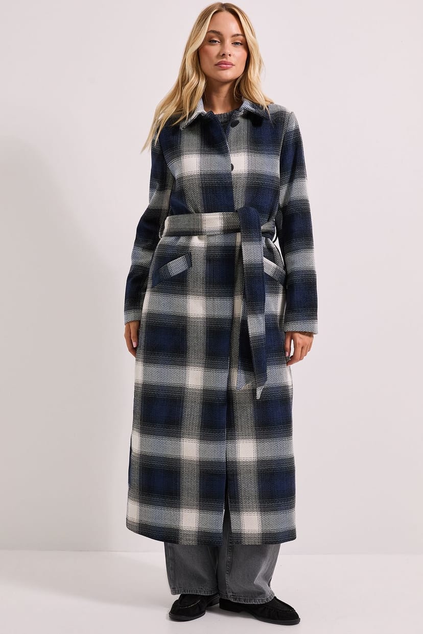 The Dorothy Perkins Navy Check Detail Fur Cuff Belted Coat is available in sizes 10, 12.