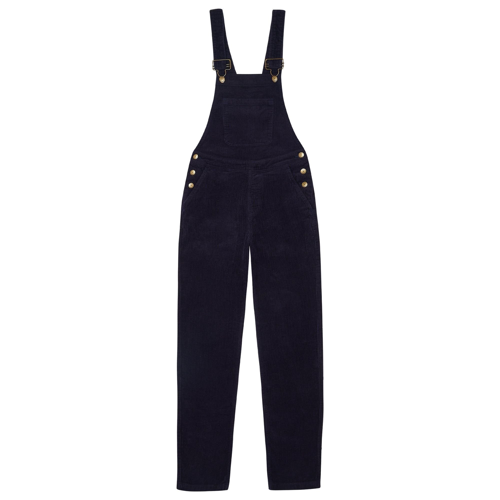 Classic navy corduroy dungarees with a chunky cord texture. Features gold-tone buttons and adjustable shoulder straps for a comfortable fit. Ideal for a casual, everyday look.