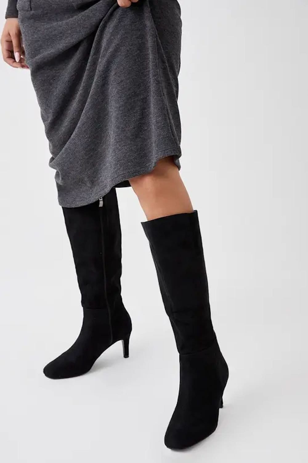 Elevate your wardrobe with these women's black knee-high heeled boots, designed to bring timeless elegance to any outfit. Crafted with a soft suede-look finish and a sleek fitted silhouette, these boots offer a refined and feminine style ideal for day-to-night wear.