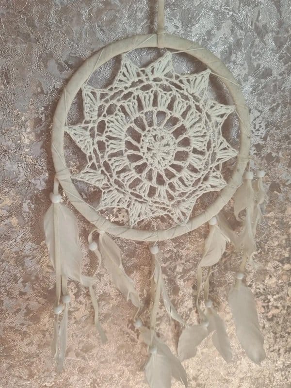 The DreamCatcher Crochet Dreamcatcher – White Feathers & Beads is ideal for wedding-guest, evening, formal.