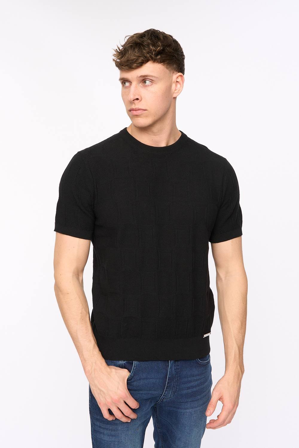 Elegant black textured knit t-shirt featuring a modern geometric design. Made from 100% cotton, it offers a breathable and textured feel. Ideal for casual and smart-casual occasions.
