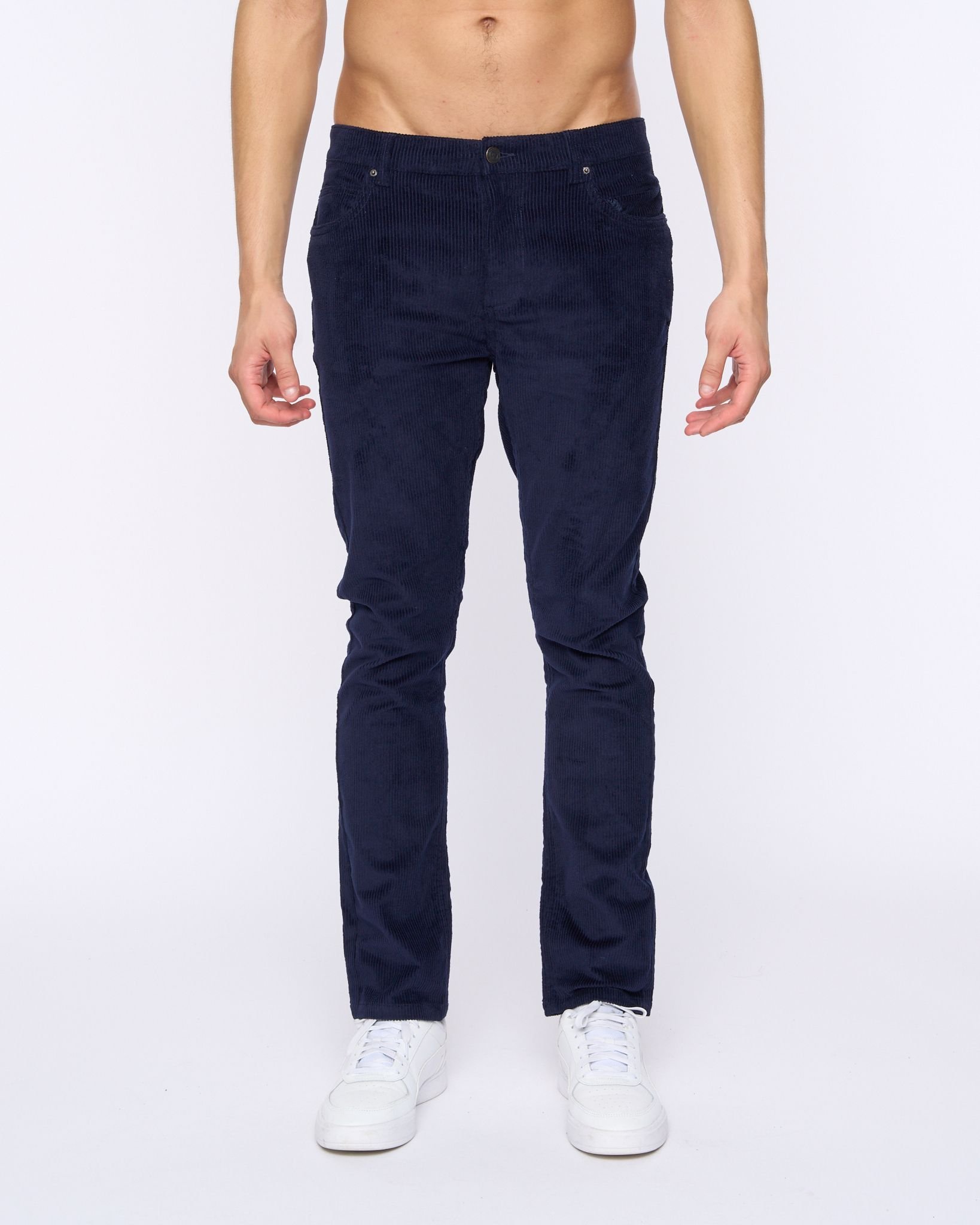 Timeless navy corduroy trousers offering a versatile and comfortable option for everyday outfits. Featuring a zip fly and a classic straight-leg silhouette.