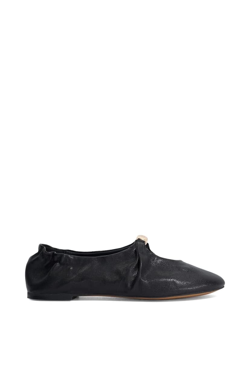 Contemporary black leather ballet pumps with a ruched back and subtle gold branding. Sleek and elegant, perfect for versatile wardrobe essentials.