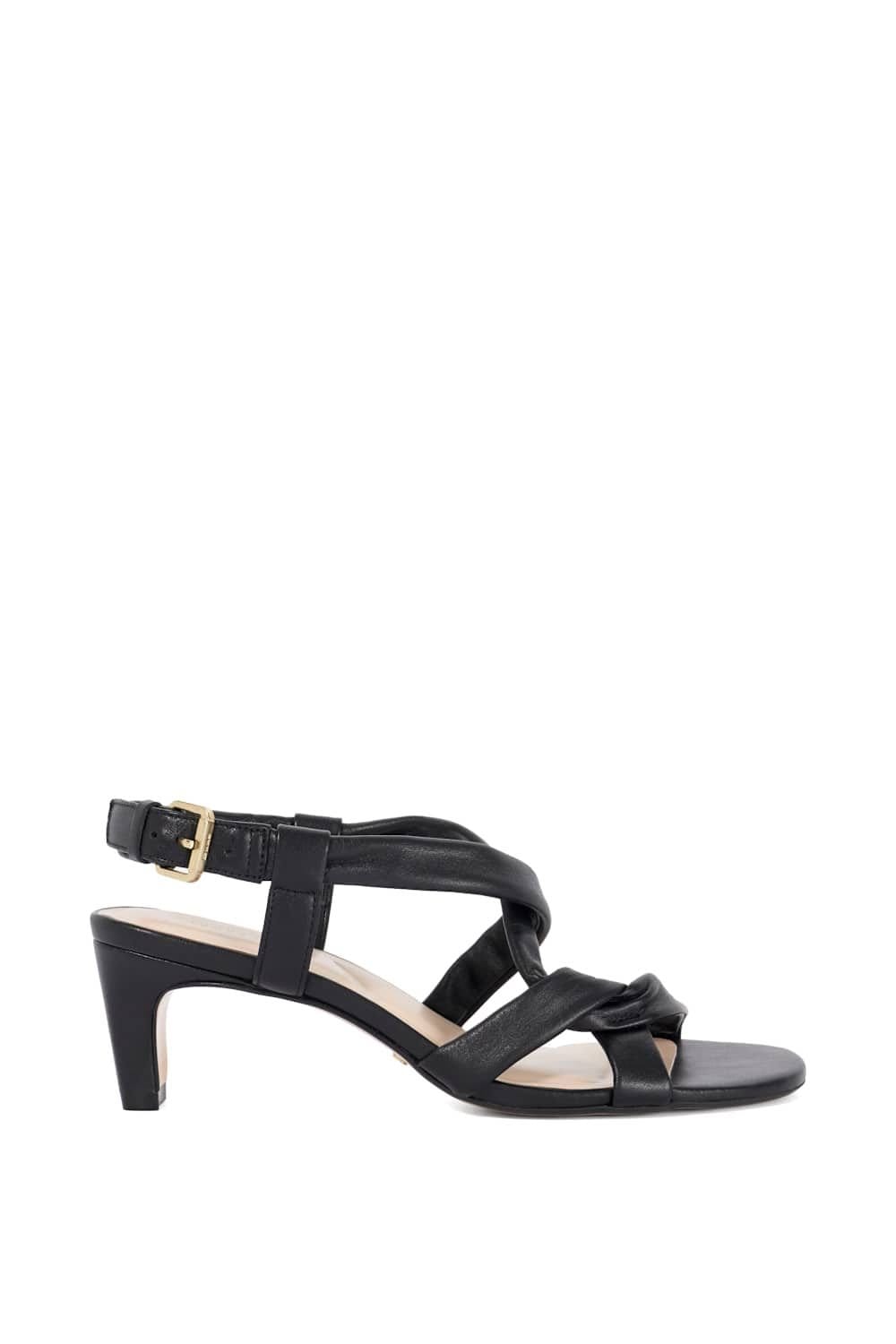 Elegant black leather/suede crossover sandals by Dune London. Featuring soft crossover straps and an adjustable buckle fastening for a personalised fit. The mid-height block heel adds a touch of sophistication, perfect for both casual and formal occasions.
