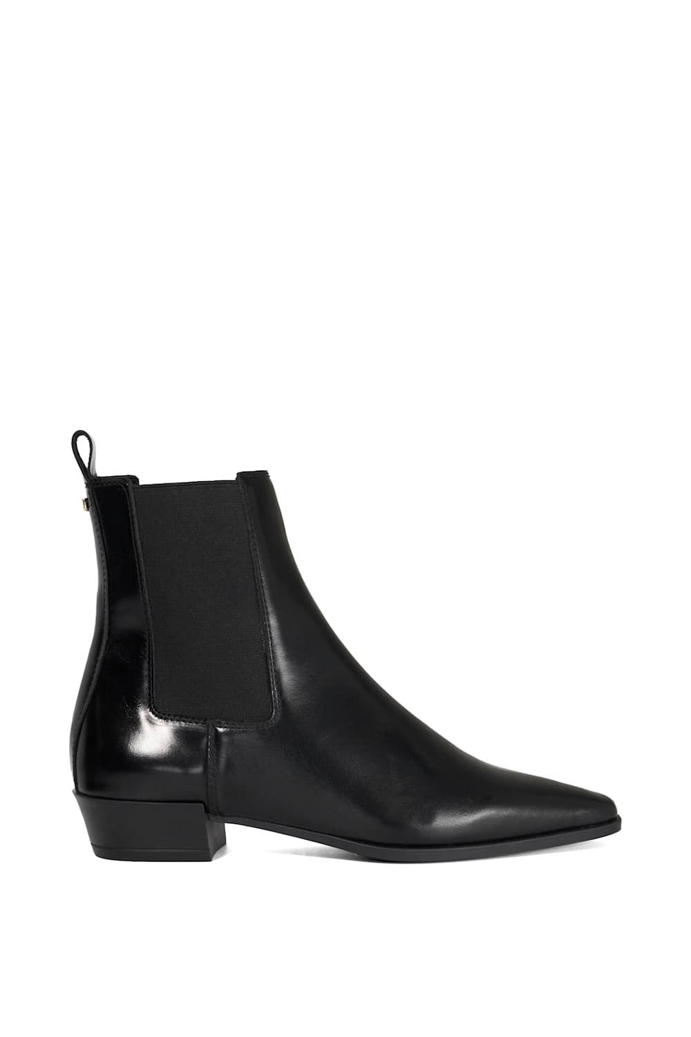 Elegant black leather ankle boots with a sharp chisel toe and gold Dune logo hardware. Designed with a rear pull tab for easy wear. Perfect for elevating your everyday look.