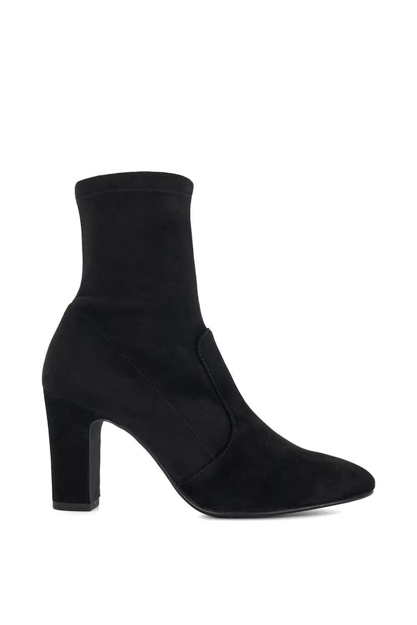 Stylish black suede ankle boots with an almond toe and block heel. Designed for easy wear with a wide-fit pull-on style, these boots are perfect for any cold-weather occasion.