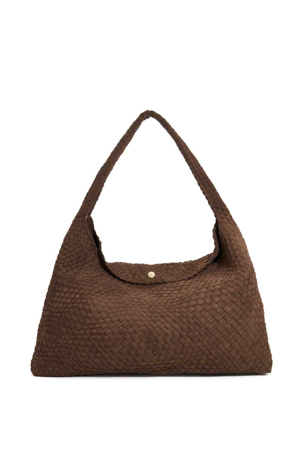 Stylish Dune London shoulder bag in brown woven material. Features a slouchy, hand-woven profile with a snap button closure. Ideal for work and travel.