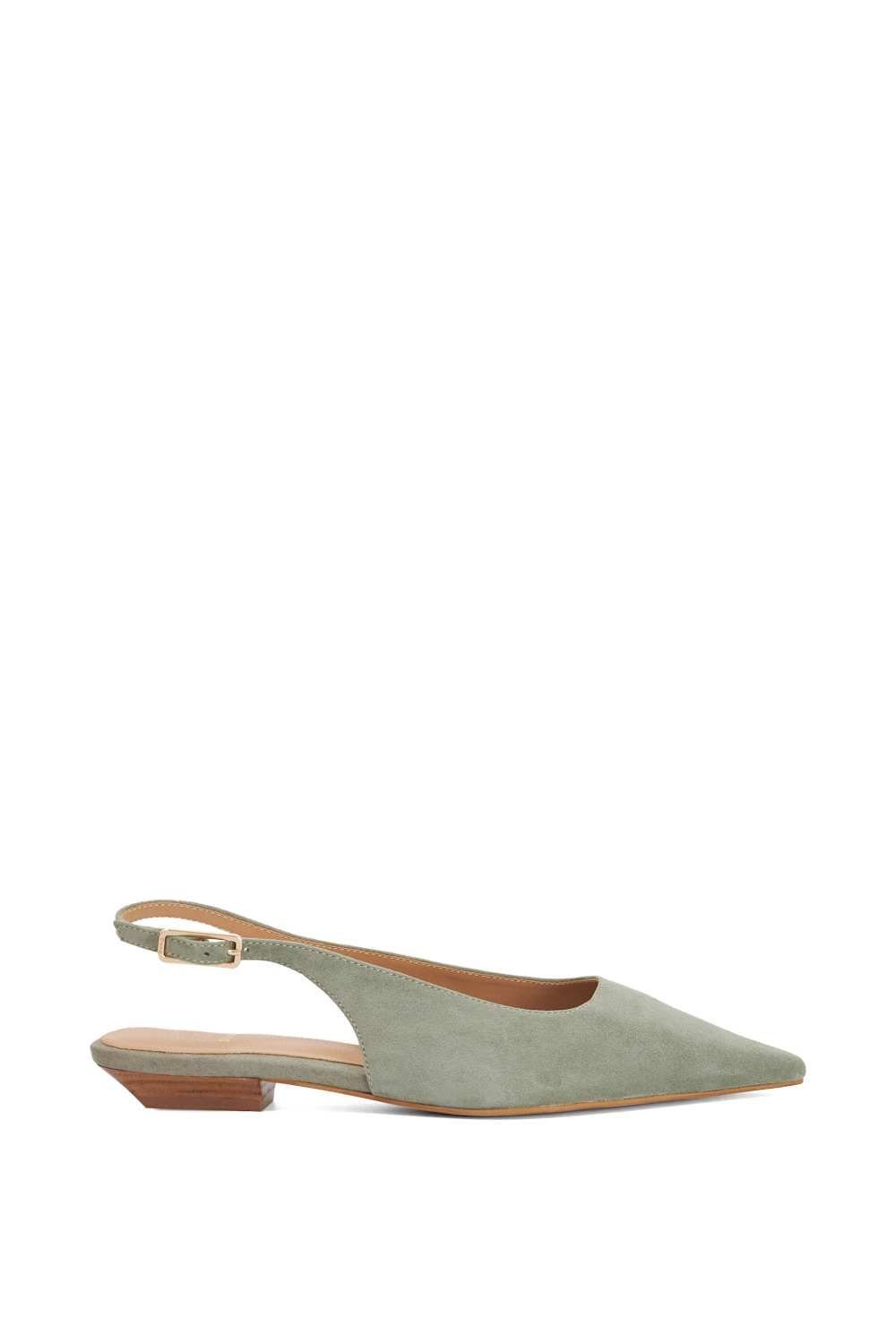 Elegant Dune London ballet pumps in green suede. Featuring a pointed toe, sculptural low heel, and adjustable ankle strap for a personalised fit. Perfect for adding a touch of architectural allure to any outfit.