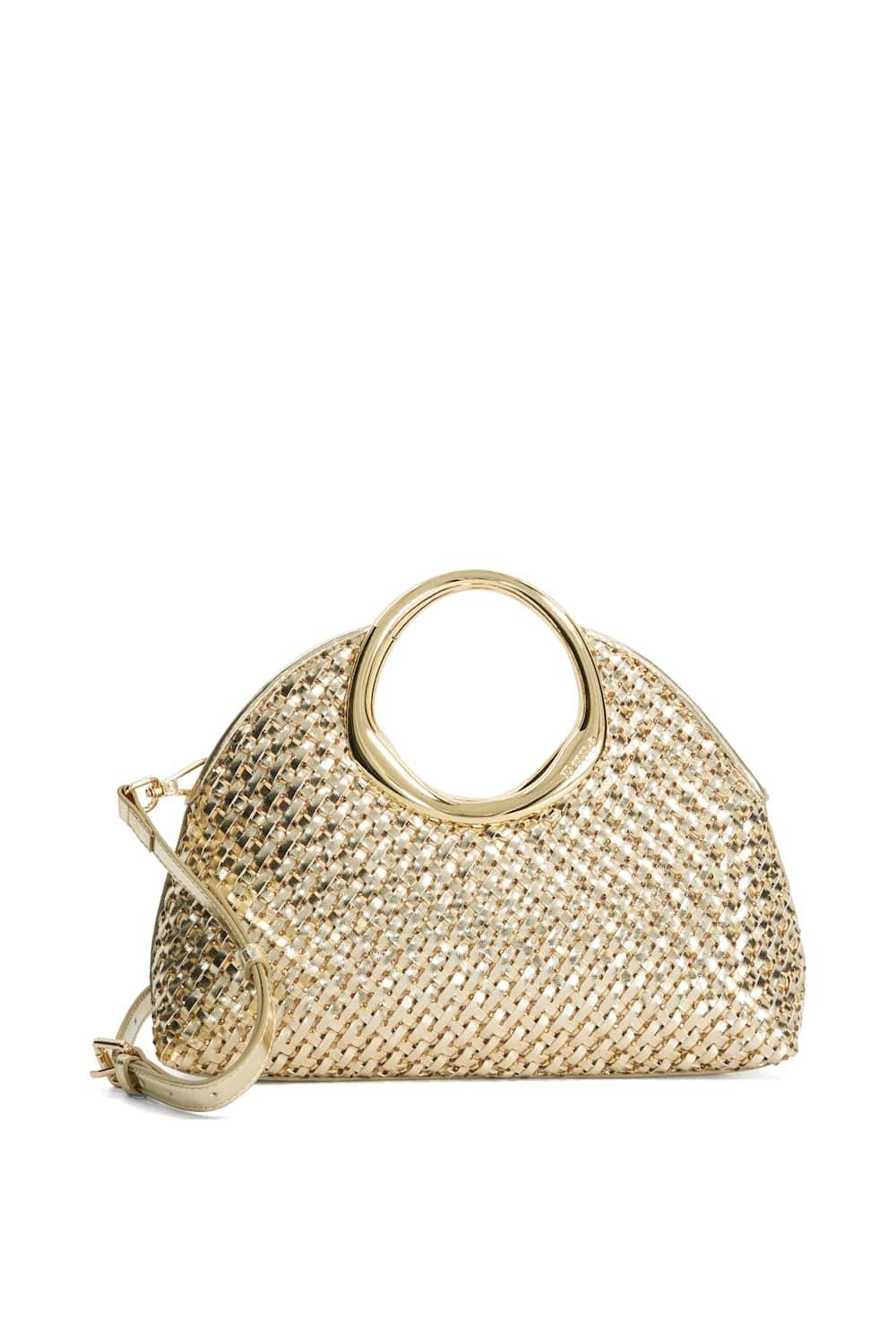 Elegant evening clutch bag in gold metallic with a sculptural circular handle and intricate woven design. Features a detachable cross-body strap and a secure magnetic fastening. Perfect for evening events.