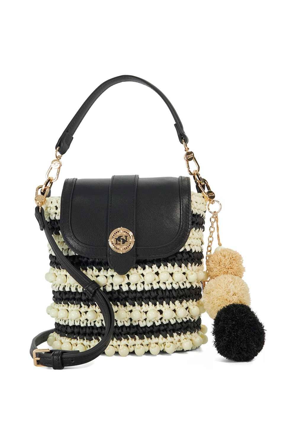 Playful Dune London crossbody bag crafted from summer-ready synthetic raffia. Features contrasting finishes, a grab handle, and gold hardware. Adorned with a charming pom-pom tassel, this compact bag is perfect for everyday use.