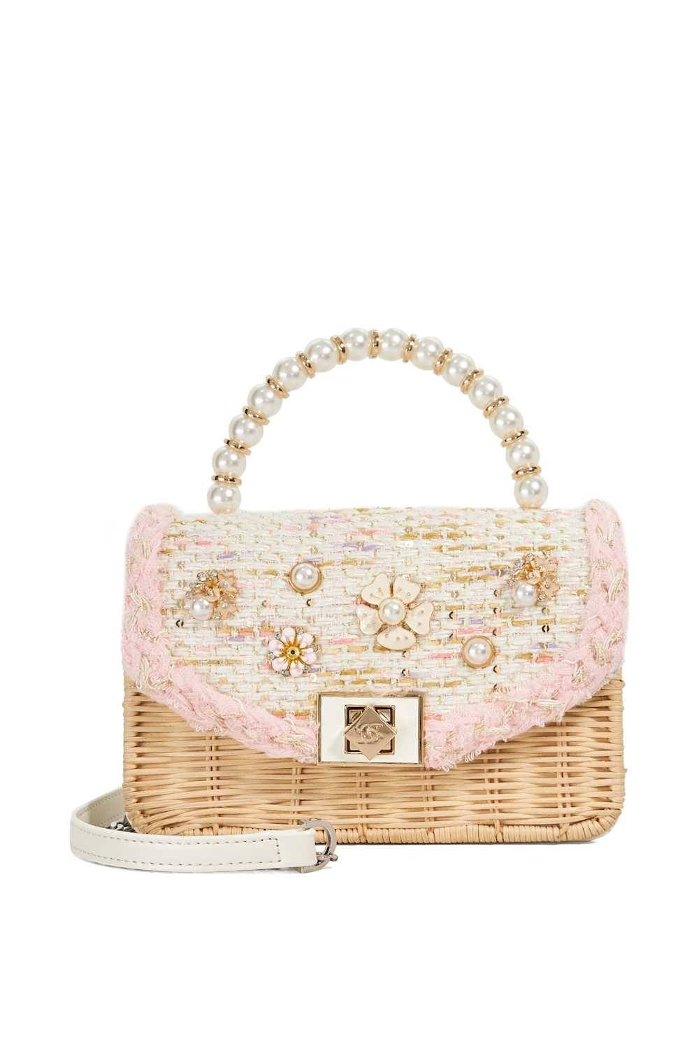 Charming Dune London Blooms bag in orange boucle and denim. This foldover bag features jewel embellished flowers and a signature turn lock closure. The beaded top handle and removable cross body strap add to its versatility.