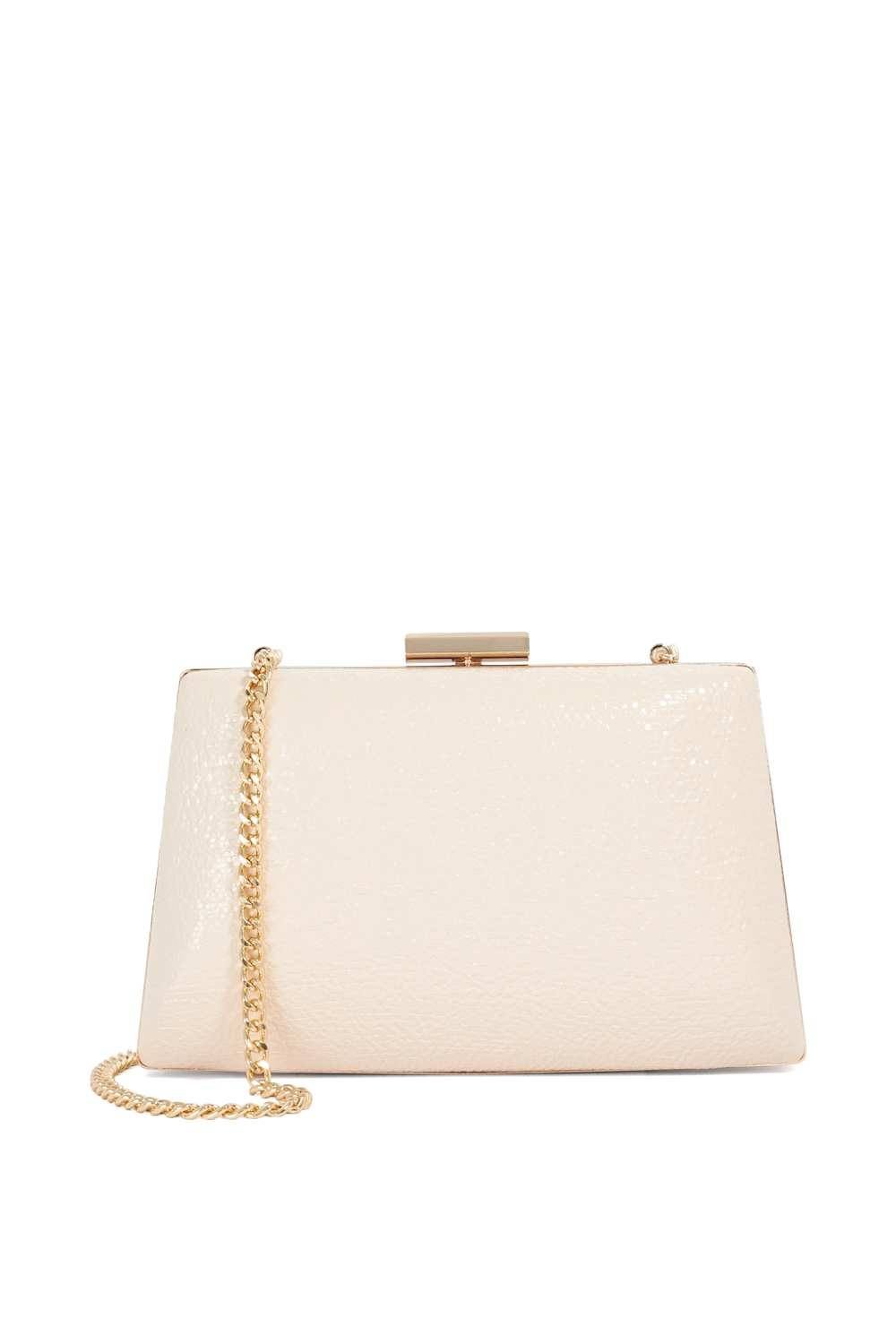 Glamorous white clutch bag from Dune London. Featuring a top clasp and a chain handle, this bag adds a touch of glamour to any ensemble. The interior is lined with a bespoke 'DD' jacquard.