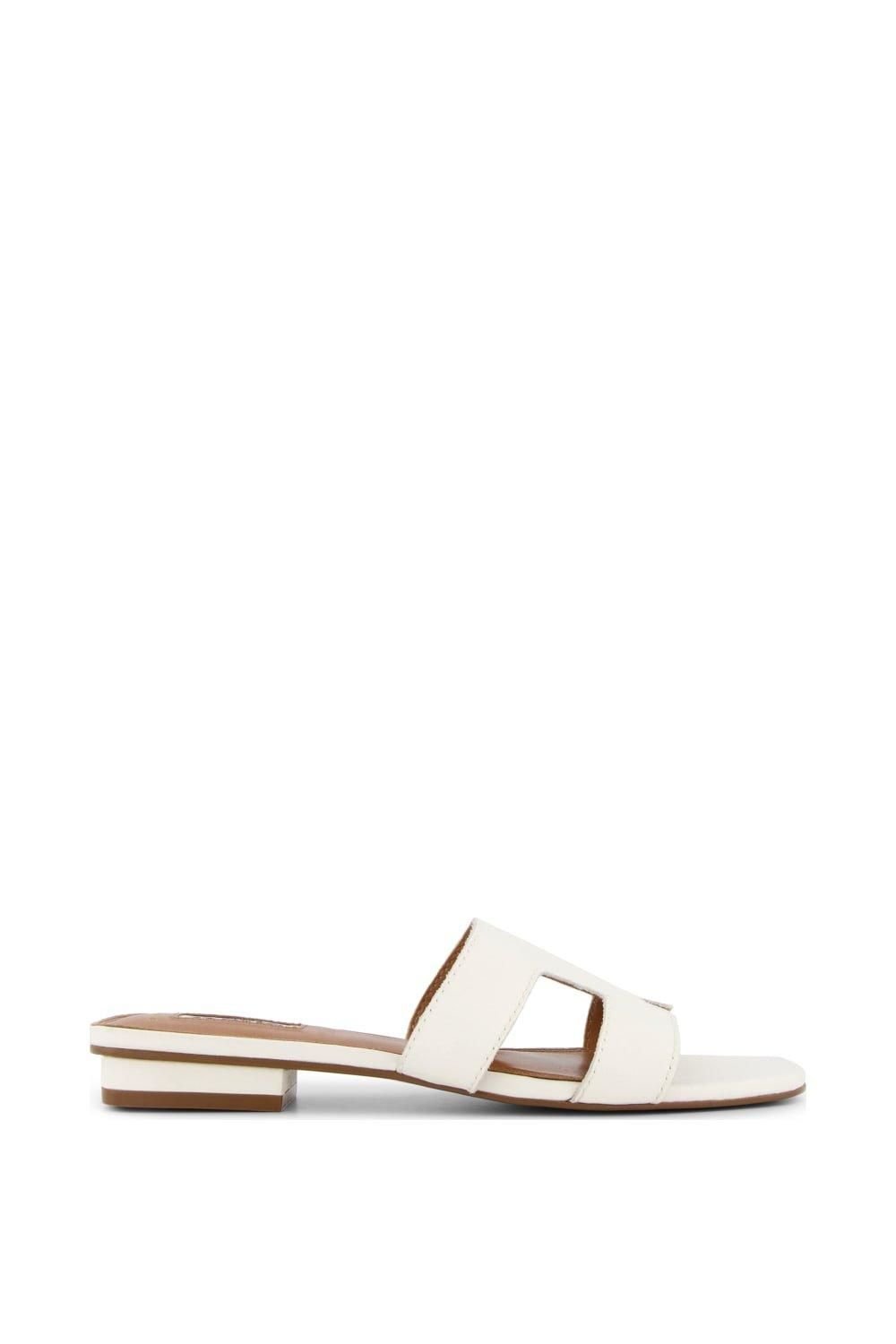 Stylish white leather sliders from Dune London, featuring a minimalist design with a cut-out middle strap. Crafted with a cushioned heel and a low platform for comfort, these sliders are perfect for casual outings.