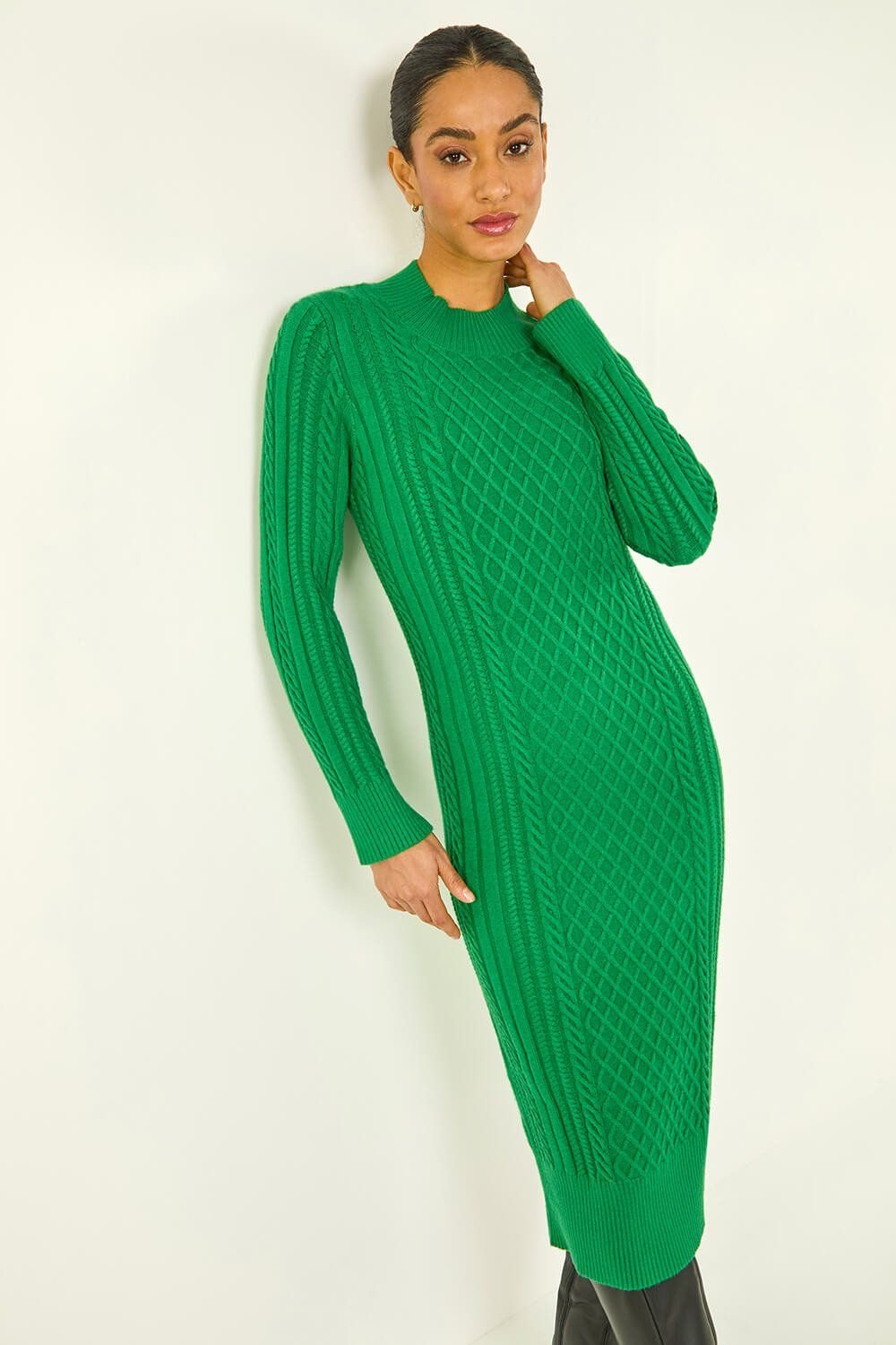 Dusk cable knit midi jumper dress in green. Featuring a luxurious cable knit fabric, this dress has full-length sleeves and a high neckline for warmth. Ideal for colder seasons.
