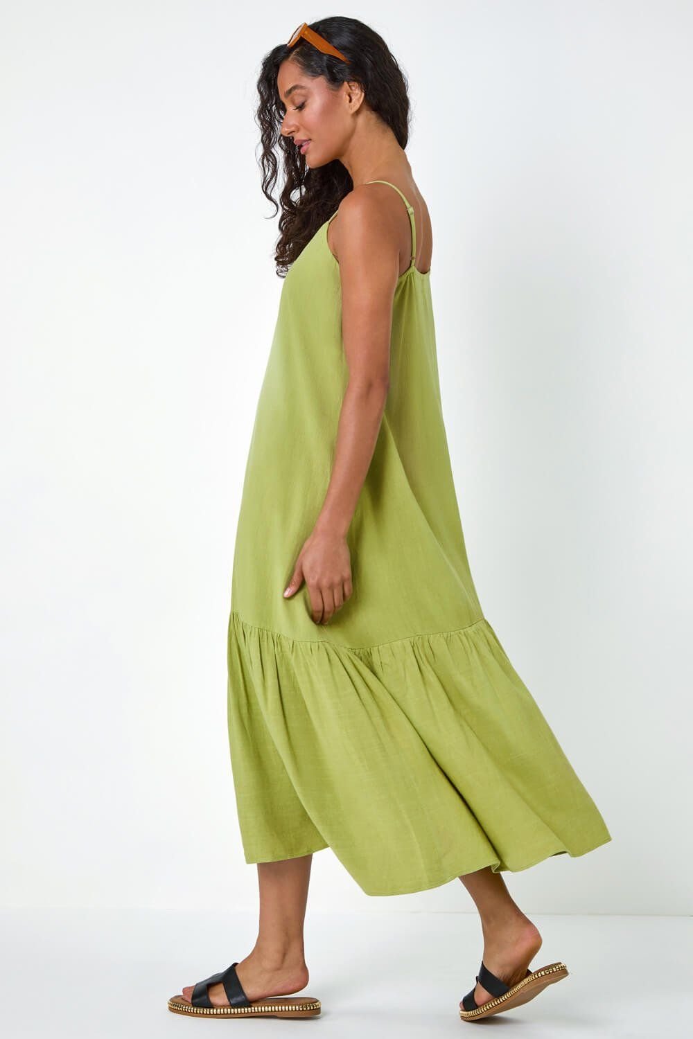 The Dusk Green Linen Strappy Tiered Maxi Dress is ideal for casual, beach, daytime.