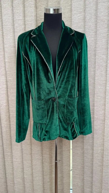 Emerald green velvet blazer with stunning rhinestone trim detailing along the lapel and seams. The soft stretch fabric offers a flattering fit, perfect for dressing up jeans, evening wear, or special occasions.