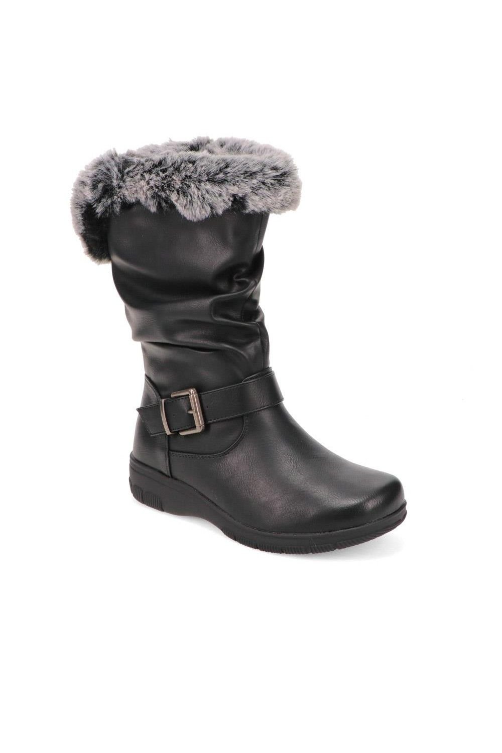 Stylish black faux-fur cuff long boots designed for winter walks. Featuring a cosy faux-fur cuff, supportive block heel, and cushioned insole for all-day comfort. The inside zip ensures easy fitting.