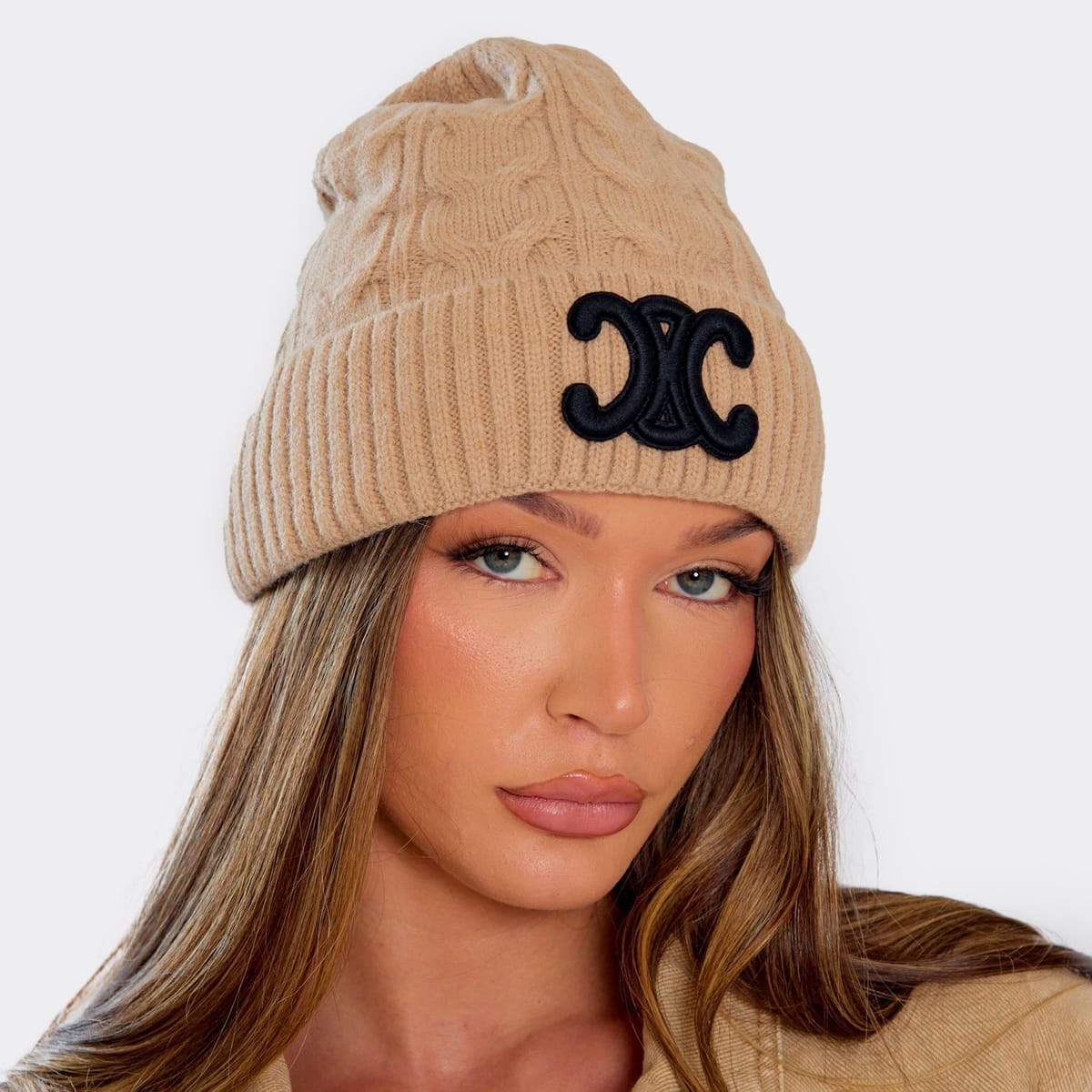 Chic and cosy, this beige cable knit beanie hat from EGO features a logo detail for a stylish touch. Perfect for cold-weather vibes.