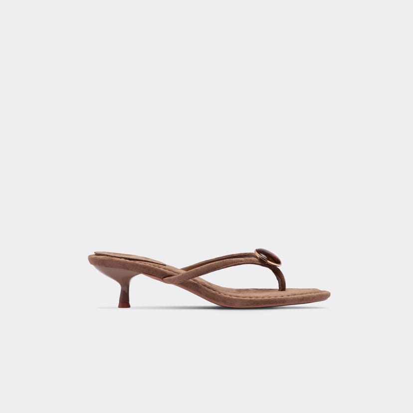 View EGO (UK)'s returns policyElegant taupe faux suede kitten heeled mule by EGO. Featuring a stone thong strap detail and a kitten heel for a chic summer look. Perfect for pairing with beachwear or casual outfits.