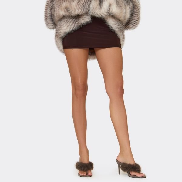 The EGO Faux Feather Thong Strap Heeled Mule in Taupe Faux Suede is available in sizes 3, 4, 5, 6, 7, 8, 9.