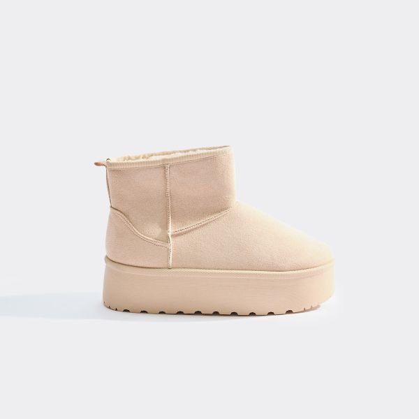Dreamy neutral hues for your off-duty look doll. Featuring a beige faux suede material, with a platform sole and an ultra mini ankle length.