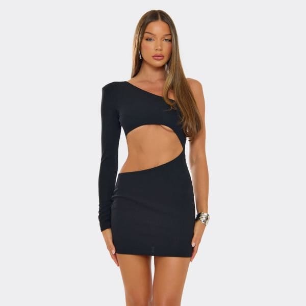 Designed with black material, asymmetric one shoulder, and cut-out detailing, this mini dress is perfect for statement evenings. The bold, chic energy is perfect for night-out vibes.