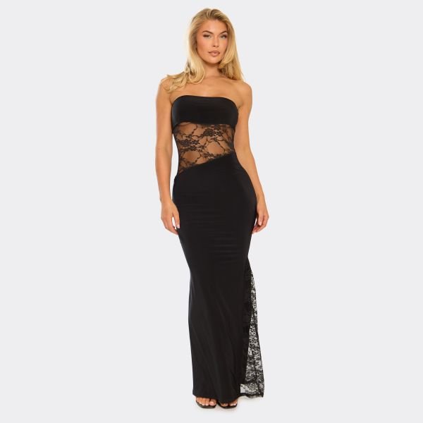 The EGO Bandeau Contrast Lace Cut Out Maxi Dress in Black is ideal for cocktails, dancing, date night.