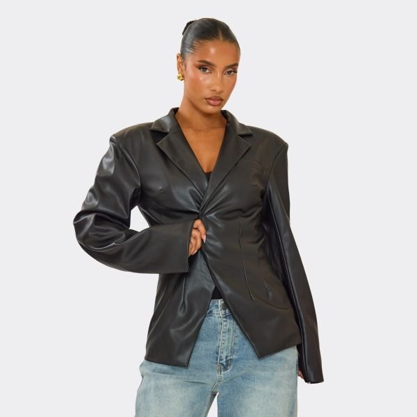 The EGO Cinched Waist Faux Leather Blazer in Black is ideal for weekend, casual.