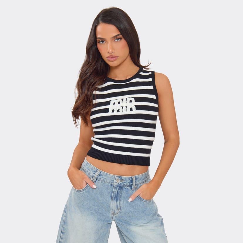 Elevate your summer street style with this black stripe knit crop vest top. Featuring a crew neck and crop vest detailing, it's perfect for pairing with your fave denim shorts and chunky sandals.