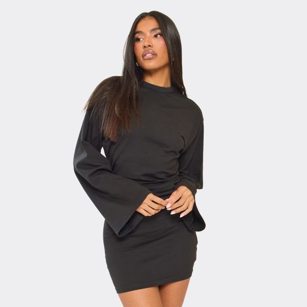 The EGO Flared Sleeve Ruched Panel Mini Dress in Black is ideal for evening, party, date-night.