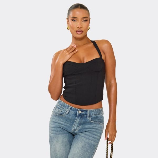The EGO Halterneck Corset Top with Corset Detailing in Black is ideal for evening, party, date-night.
