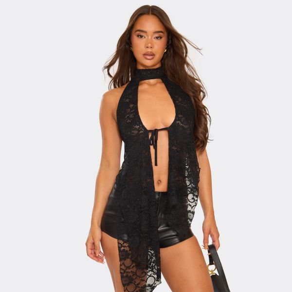 The EGO High Neck Lace Top with Open Tie Front in Black is ideal for evening, party, casual.