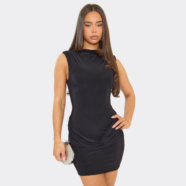 The EGO High Neck Shoulder Pad Draped Front Mini Dress in Black is ideal for evening, party.