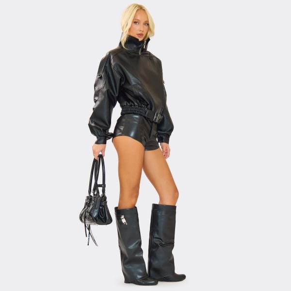Meet your new power boots: the I-Am-The-One Padlock Wedge Heels. These knee-high boots in sleek black faux leather are all about making a big statement. Featuring an edgy padlock detail that’s as fierce as you are, plus a wedge heel that gives you that perfect lift, these boots are your go-to for turning heads.