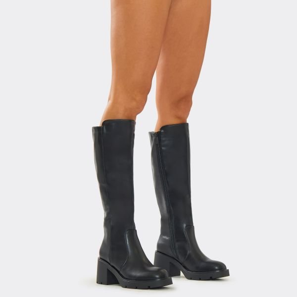 The EGO Asymmetric Knee High Long Boot in Black Faux Leather is available in sizes 3, 4, 5, 6, 7, 8.