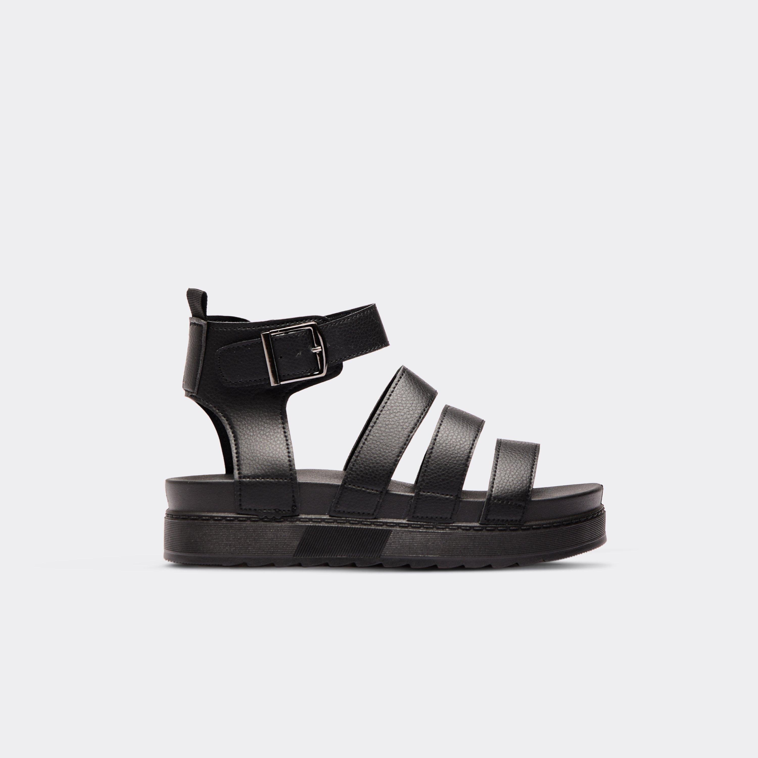 The EGO Black Faux Leather Strappy Platform Chunky Sandal is available in sizes 3, 4, 5, 6, 7, 8.