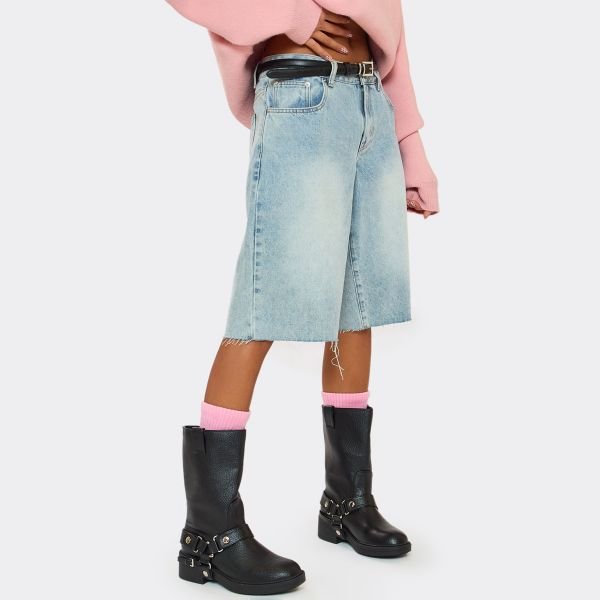 Designed for nights out or street-style vibes, these boots feature black faux leather with locked-in side buckle detailing and an ankle-length cut for a sleek finish. Ideal for pairing with mini skirts or skinny trousers.
