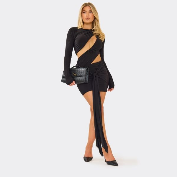 The EGO Long Sleeve Cut Out Drape Mini Dress in Black is ideal for party, social, night out.