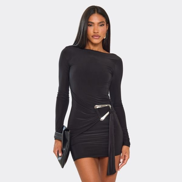 The EGO Long Sleeve Drape Trim Detail Mini Dress in Black is available in sizes C06.