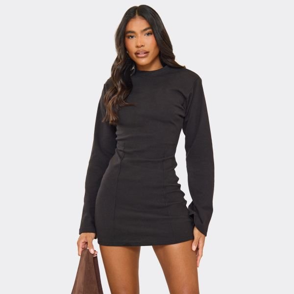 The EGO Long Sleeve Shoulder Pad Cinched Waist Mini Dress in Black is ideal for evening, party, date-night.